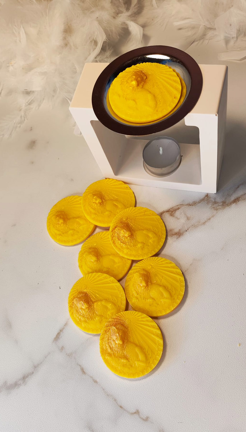 “Saca tu medallón de cera aromatizada (wax melt) de su bolsa impermeable y colócalo en la parte superior de tu quemador. Enciende una pequeña vela debajo y deja que la cera se funda lentamente. Su aroma llenará tu espacio de energía y bienestar.”