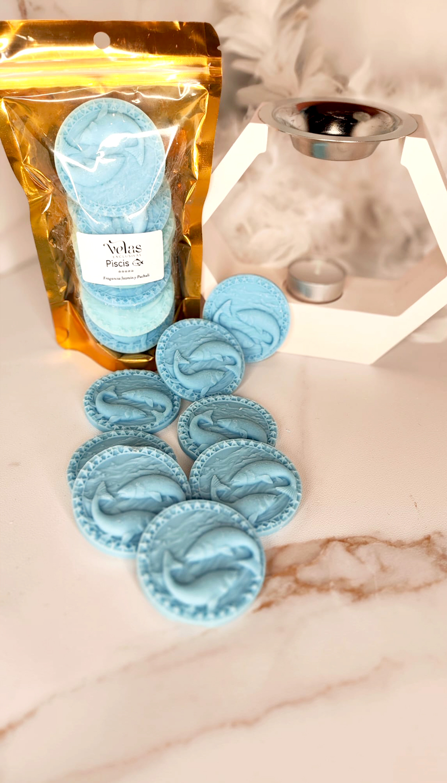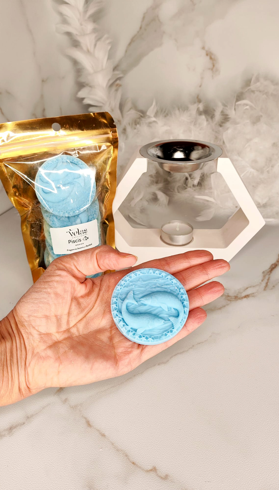 “Saca tu medallón de cera aromatizada (wax melt) de su bolsa impermeable y colócalo en la parte superior de tu quemador. Enciende una pequeña vela debajo y deja que la cera se funda lentamente. Su aroma llenará tu espacio de energía y bienestar.”