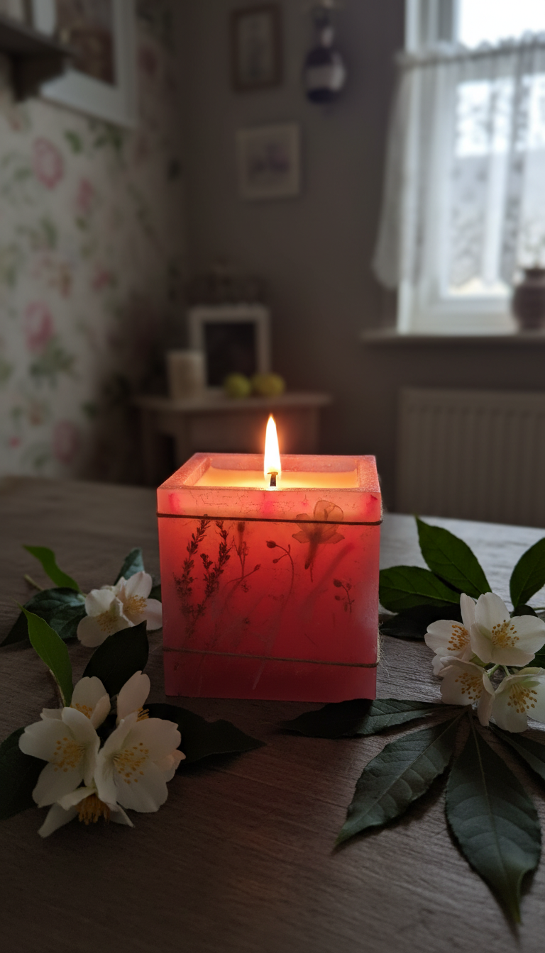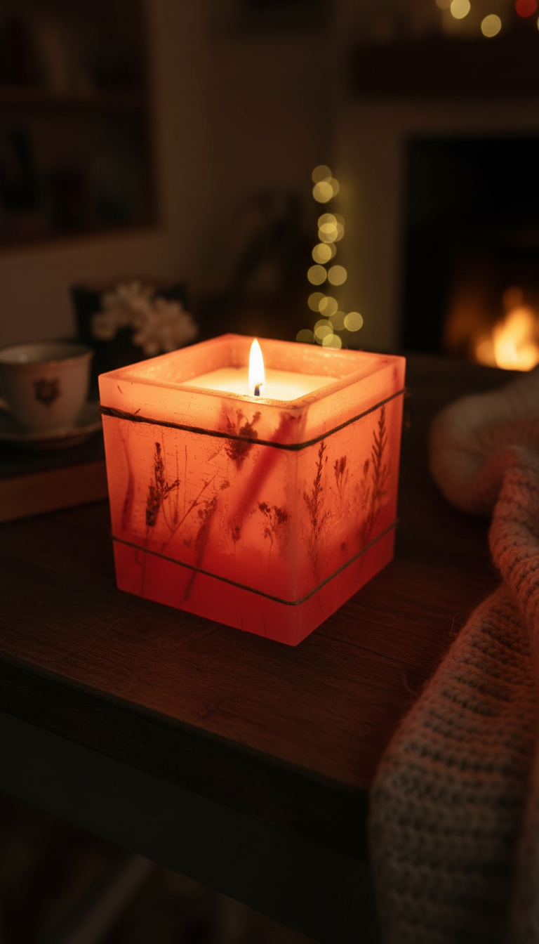 El fanal cuadrado translúcido está cuidadosamente elaborado a mano e incorpora plantas naturales insertadas en sus paredes, creando un efecto visual delicado y orgánico que convierte cada vela en una pieza decorativa única. Cuando la vela se enciende, la luz atraviesa suavemente el fanal y resalta las formas naturales de las plantas, creando una atmósfera cálida y relajante.
